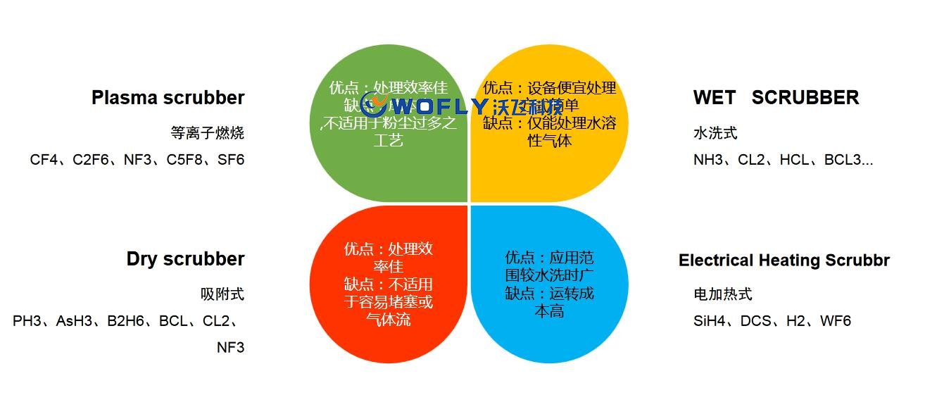 由于以上四種氣體對(duì)環(huán)境或人體皆具有一定的危害性,必須防止其直接排放大氣中,所以,一般半導(dǎo)體廠都以加裝大型中央廢氣處理系統(tǒng).但此系統(tǒng)僅以水洗滌廢氣.故其應(yīng)用范圍僅限于處理水溶性氣體,無(wú)法因應(yīng)日新月異且分工細(xì)微的半導(dǎo)體工藝廢氣.因此必須依據(jù)各工藝所衍生出的氣體特性種類,選擇搭配相對(duì)應(yīng)的廢氣處理設(shè)備,才能有效解決廢氣問(wèn)題.而由于工作區(qū)域多半離中央廢氣處理系統(tǒng)前,常因氣體特性導(dǎo)致管路中結(jié)晶或粉塵堆積,造成管路堵塞后導(dǎo)致氣體泄漏,嚴(yán)重者甚至引起爆炸,無(wú)法確?,F(xiàn)場(chǎng)工作人員之工作安全.因此在工作區(qū)域需配置適合工藝氣體特性的小型廢氣處理設(shè)備(Local Scrubber),以減少在工作區(qū)域滯留的廢氣,確保人員安全。