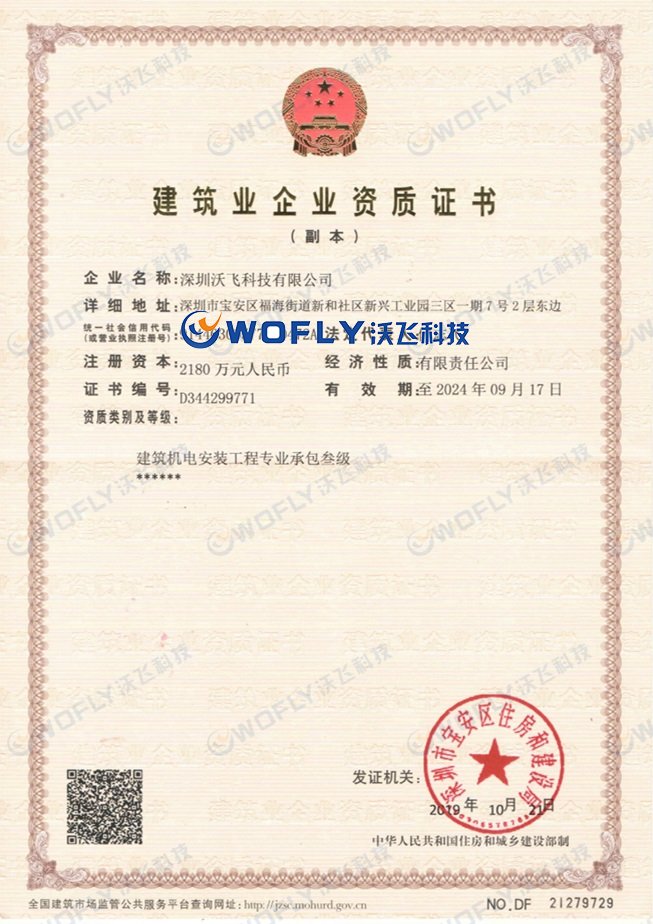 沃飛具有國(guó)家建筑機(jī)電安裝專(zhuān)業(yè)承包資質(zhì),國(guó)家安全生產(chǎn)許可證,GC2壓力管道安裝資質(zhì)。