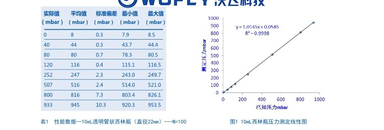 采用填充氮氣壓力為0、40、80、120、253、507、800和933 mbar的一組壓力標 準評估用于測定總頂空壓力的系統(tǒng)性能。通過直徑為22mm的10mL西林瓶建立這些標 準。使用FMS-1400頂空水汽/真空度測試儀測定每種標準100次。FMS-1400頂空水汽/真 空度測試儀測定容器頂空中水蒸氣分子的激光吸收量。吸收信號寬度與氮氣壓力相關。根 據(jù)測得數(shù)據(jù)確定平均濃度、標準偏差、最大讀數(shù)和最小讀數(shù),這些數(shù)據(jù)如表1所示。圖1所示 為表1中壓力數(shù)據(jù)的線性圖。