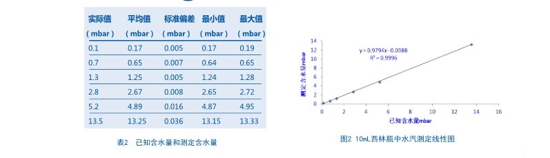 使用填充水蒸汽壓力為0.1、0.7、1.3、2.8、5.2、13.5mbar的一組水汽標準物質評估用于測定水蒸氣壓力的系統(tǒng)性能。通過直徑為 22mm的10mL西林瓶建立這些標準。使用FMS-1400水汽/真空度測試儀測量每種標準物質100次。FMS-1400水汽/真空度測試儀測量容器頂空中水蒸汽分子激光吸收量。吸收信號振幅與頂空水汽汽濃度成比例。根據(jù)測得的數(shù)據(jù)集確定平均濃度、標準偏差、最大讀數(shù)和最小讀數(shù),這些數(shù)據(jù)如表2所示。圖2所示為表2中水分濃度數(shù)據(jù)線性圖。這種測定的無損特性使得我們可以建立系統(tǒng)性能的全面統(tǒng)計文檔。從應用的觀點來看,采用無損測量可以在同一個樣品上隨著時間進行多次測定(例如在整個貨架期內進行多次測定),并且進行全面的批量分析可幫助客戶深入了解工藝的變化和對應的優(yōu)化措施。